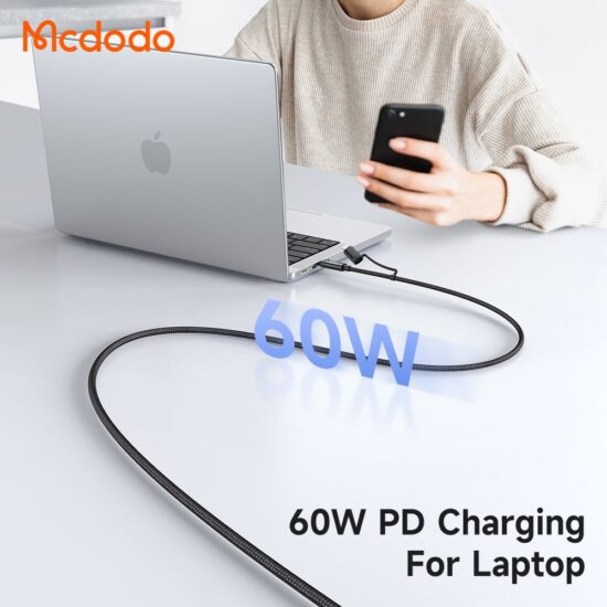 این ویژگی، ستارهی درخشان Mcdodo CA-199 است. با ترکیب هوشمندانه کانکتورهای USB-A به USB-C/لایتنینگ/میکرو USB و همچنین تبدیل USB-A به USB-C برای ورودی، این کابل عملاً تمام نیازهای شما را پوشش میدهد. میتوانید گوشی اندرویدی جدید خود را شارژ کنید، آیفون دوستتان را به برق بزنید، ایرپاد خود را جان دوباره ببخشید و حتی لپتاپهای دارای پورت Type-C (مانند مکبوکها و بسیاری از لپتاپهای ویندوزی جدید) را با سرعت 60 وات تغذیه کنید. این گسترهی وسیع از سازگاری، CA-199 را به تنها کابلی تبدیل میکند که در کیف یا کولهپشتی خود به آن نیاز دارید. تصور کنید در یک سفر هستید و فقط با یک کابل، تمام گجتهای خود را بدون دغدغهی یافتن کابل صحیح، شارژ میکنید؛ این همان آرامش خاطری است که CA-199 به ارمغان میآورد.