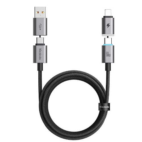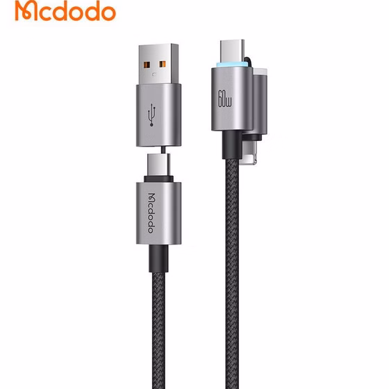 ویژگی “4 کاره” بودن، برگ برنده اصلی کابل Mcdodo CA-6560 است. این کابل با در اختیار داشتن چهار نوع کانکتور ورودی و خروجی مختلف، عملاً به یک ارکستر سمفونیک از اتصالات تبدیل شده است که هر نت مورد نیاز شما را مینوازد. به طور خلاصه، این کابل شامل دو کانکتور ورودی (USB-A و Type-C) و دو کانکتور خروجی (Type-C و Lightning) است که به صورت هوشمندانه در یک مجموعه واحد ادغام شدهاند. بیایید دقیقتر به این جادو نگاه کنیم: