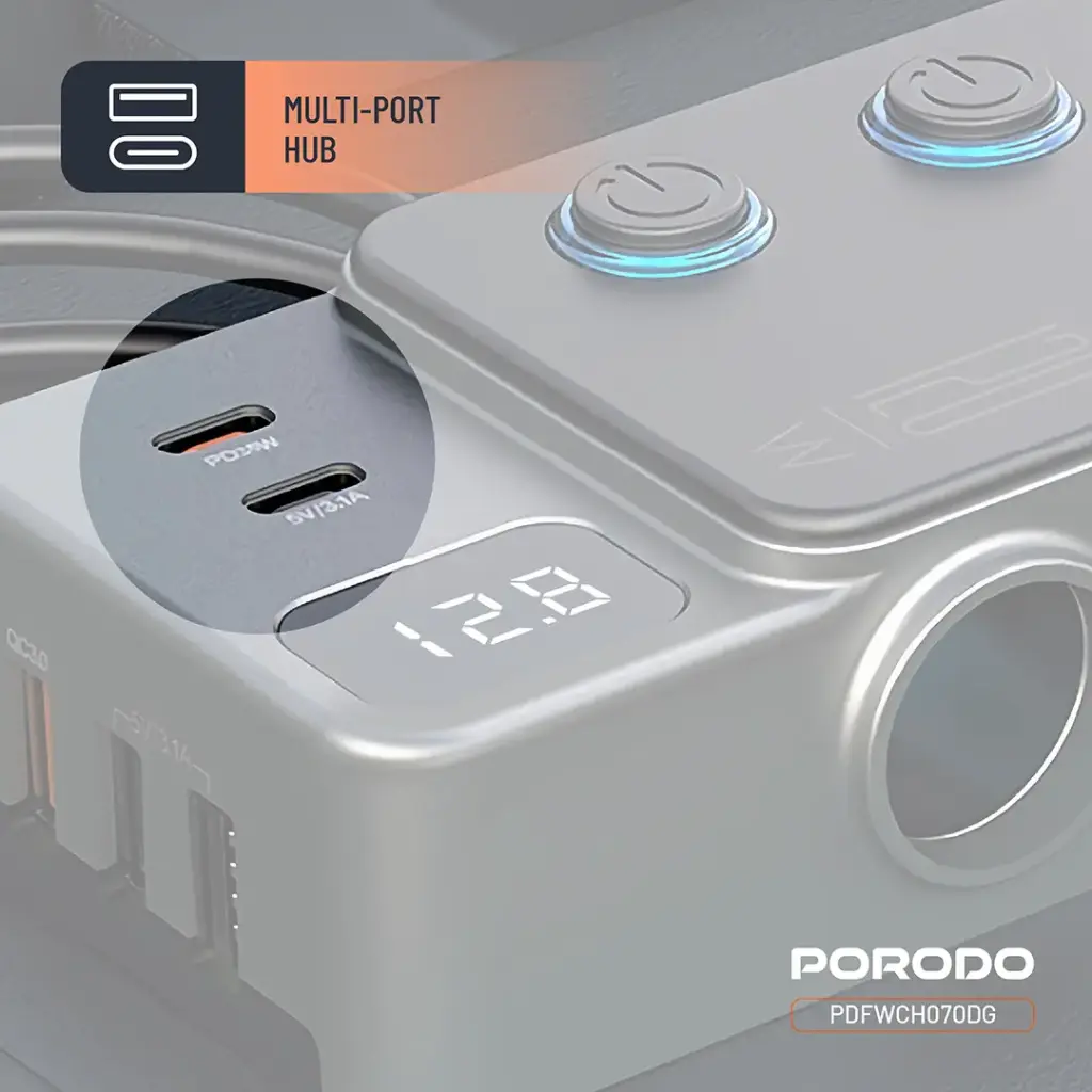 همین عدد 120 وات به تنهایی گویای تمام قابلیتهای این محصول است. در حالی که بسیاری از شارژرهای فندکی موجود در بازار نهایتاً توانایی ارائه 30 یا 45 وات را دارند، پرودو با مدل PDFWCH070DG به معنای واقعی کلمه “بازی را تغییر داده” است. این توان عظیم به شما اجازه میدهد تا همزمان چندین دستگاه را با حداکثر سرعت ممکن شارژ کنید. فکرش را بکنید: تلفن همراه شما از طریق پورت Type-C با فناوری Power Delivery (PD) در حال شارژ سریع است، همسر شما از طریق پورت USB-A از فناوری Quick Charge (QC) بهره میبرد و شاید حتی یک لپتاپ کوچک یا مکبوک نیز در حال تغذیه از انرژی این دستگاه باشد. این سطح از قدرت و کارایی، شارژر فندکی پرودو را به ابزاری بیبدیل برای رانندگان حرفهای، خانوادههای پرجمعیت و علاقهمندان به تکنولوژی تبدیل میکند که همیشه در حال حرکت هستند و نمیخواهند لحظهای از دنیای دیجیتال خود دور بمانند.